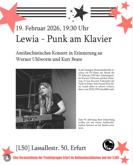 Lewia – Punk am Klavier. Antifaschistisches Konzert in Erinnerung an Werner Uhlworm und Kurt Beate